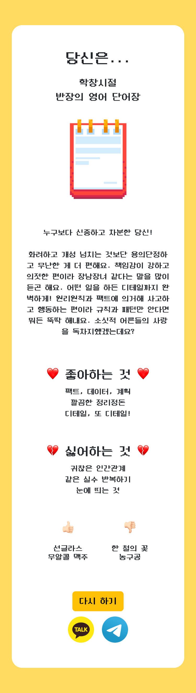 결과 페이지는 제목 / 이미지 / 좋아하는 것 / 싫어하는 것 / 잘 맞는 유형 / 잘 맞지 않는 유형을 보여주며,