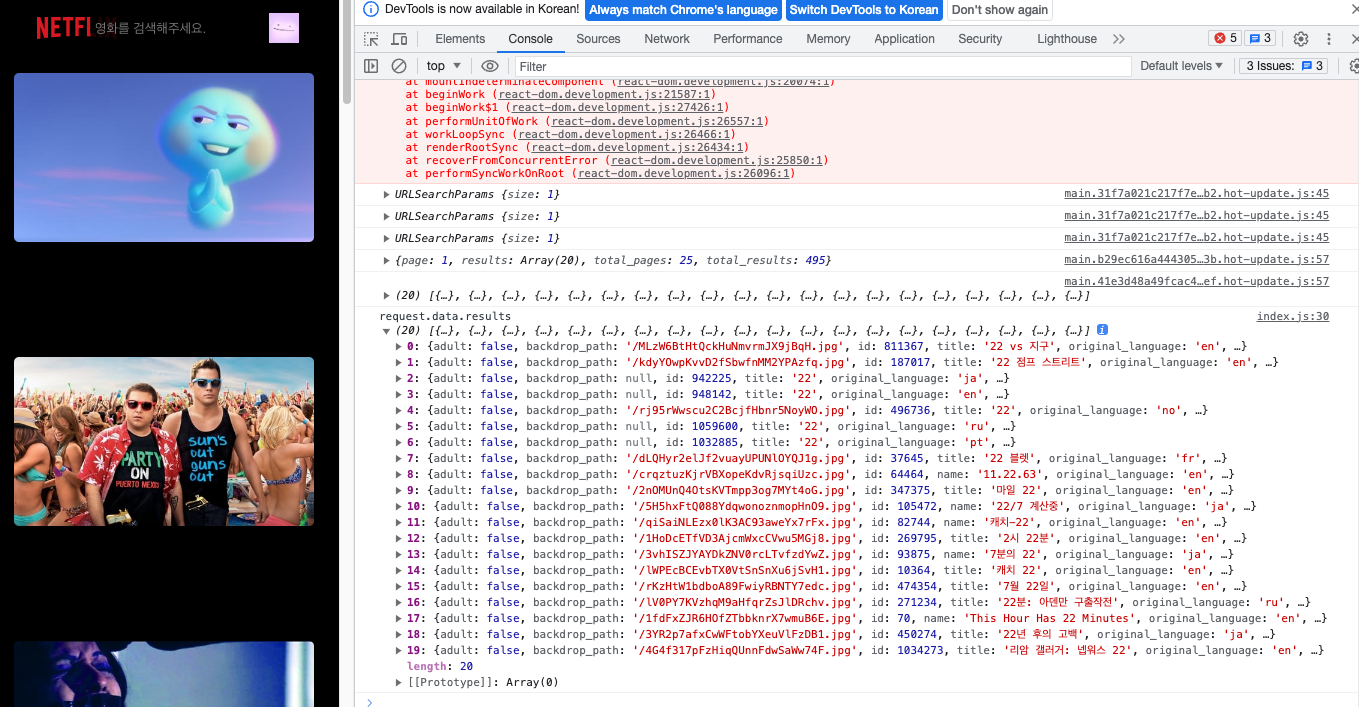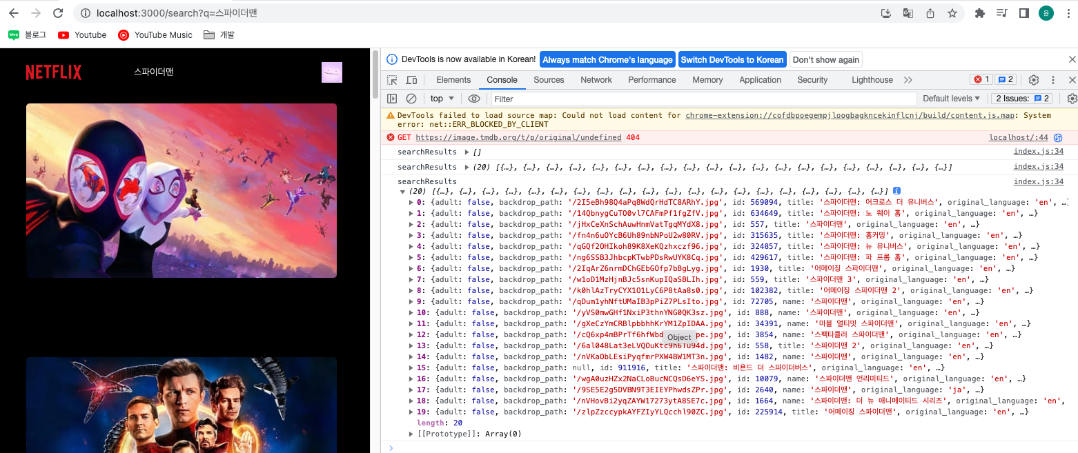 지금 스파이더맨을 검색했을 때 searchResults가 나오고 있다. 스파이더맨에 해당되는 영화들이다.