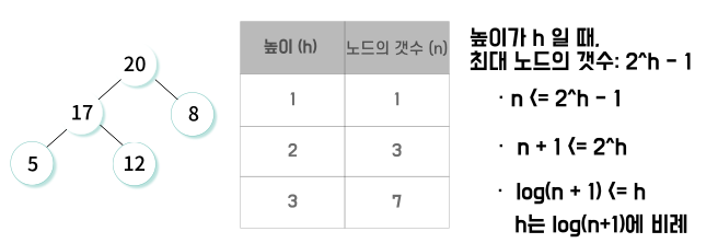 높이가 3일 때는 노드 20, 17, 8, 5, 12로 노드의 개수는 5개가 되는데 이를 2**h -1 로 정리할 수 있다.