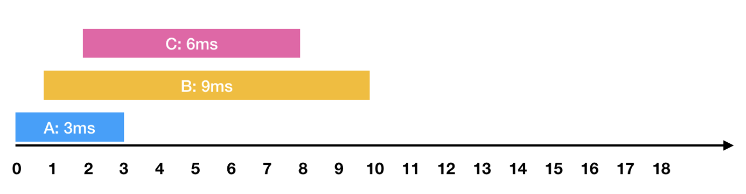이렇게 A → C → B의 순서로 처리하면 각 작업의 요청부터 종료까지 걸린 시간의 평균은 9ms(= (3 + 7 + 17) / 3)가 됩니다.