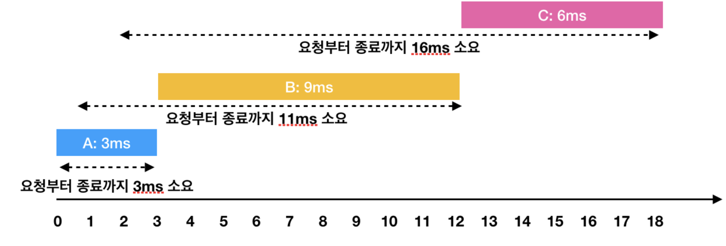 이 때 각 작업의 요청부터 종료까지 걸린 시간의 평균은 10ms(= (3 + 11 + 16) / 3)가 됩니다.
