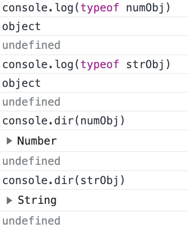 이후 numObj, strObj는 각각 new 키워드로 Number, String과 같은 래퍼 객체의 생성자 함수를 호출해 원시 데이터를 감싸는 객체를 생성했다. 실제로 타입을 찍어보니 둘다 오브젝트였고, 그 중 strObj만 들여다 보았다.