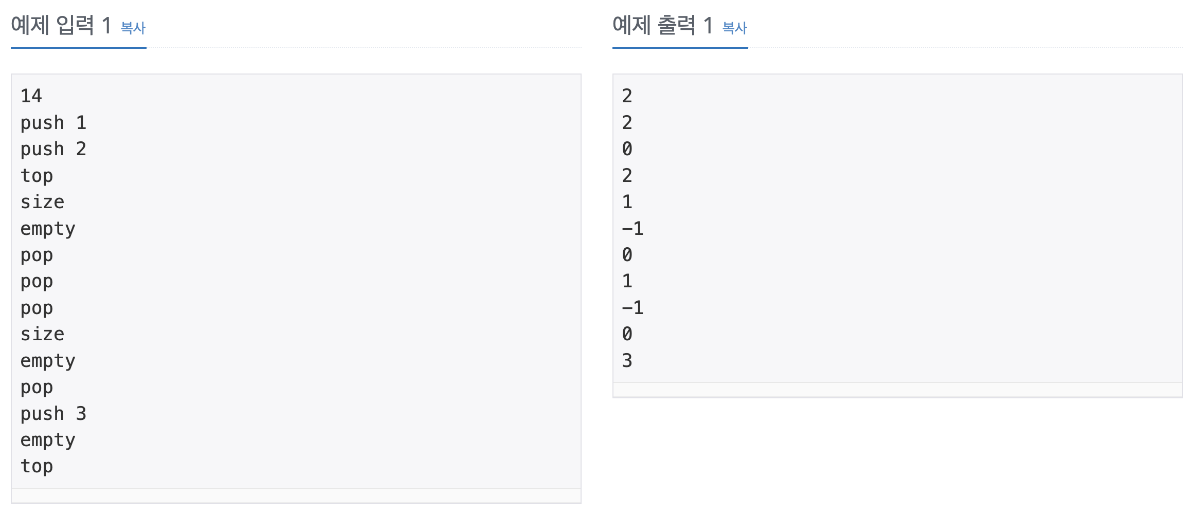 - empty: 스택이 비어있으면 1, 아니면 0을 출력한다.