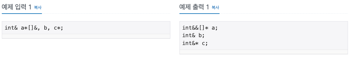 a의 타입은 int&&[]*, b는 int&, c는 int&*이 된다. 변수의 오른편에 있는 변수형은 순서를 뒤집어서 왼편에 붙일 수 있다. 따라서, int*& a는 int a&*와 같다.