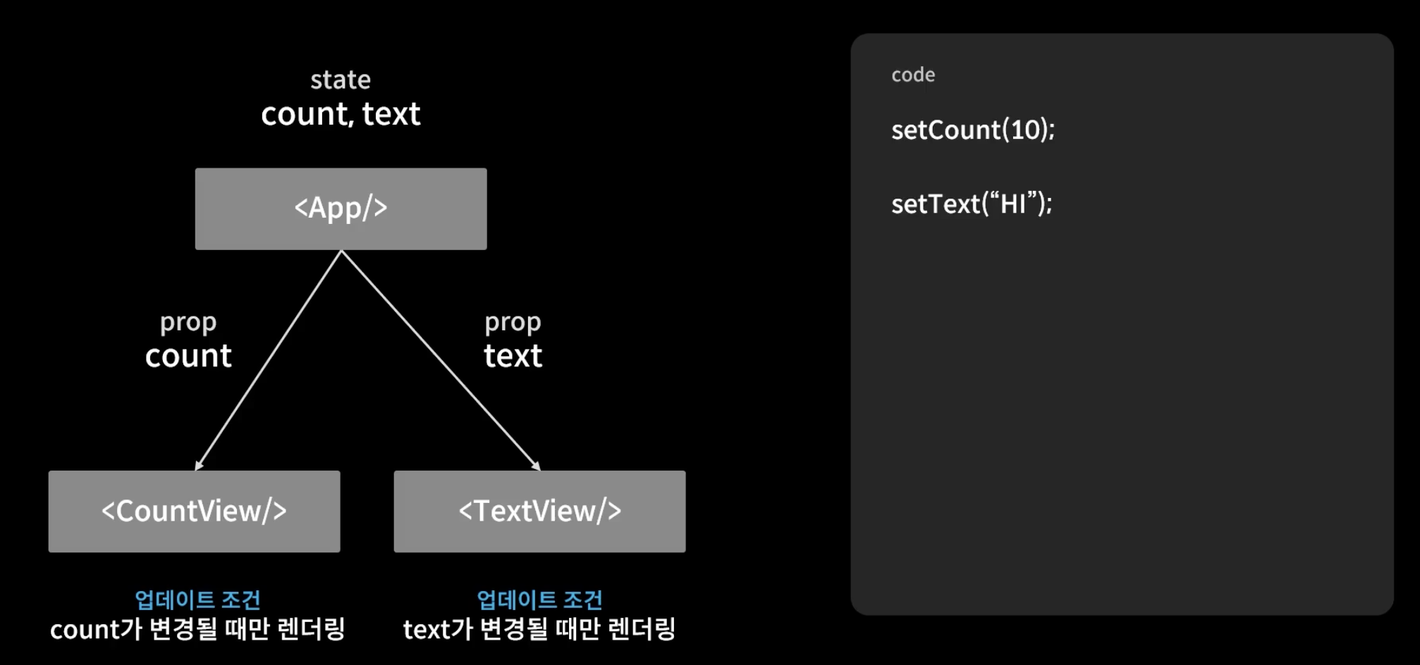 얘네는 count, text를 prop로 받고 있어서 이게 하나라도 변경되면 setCount, setText가 변화함에 따라 부모 컴포넌트와 그 밑에 있는 컴포넌트들도 모두 리렌더링을 하게 된다.
