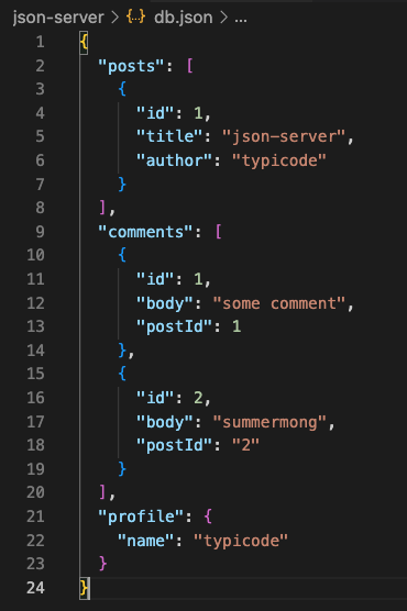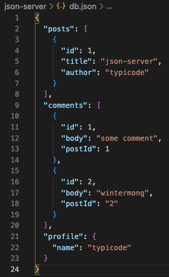 { "id": 1, "title": "json-server", "author": "typicode" }