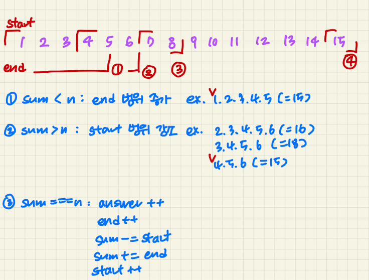 이 문제에서 슬라이딩 윈도우를 사용한 풀이는 시작과 끝의 범위, sum을 1로 초기화한다.