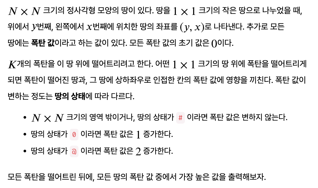 - 먼저 폭탄이 떨어지는 곳 + 폭탄이 떨어진 상하좌우를 모두 계산해야 한다.