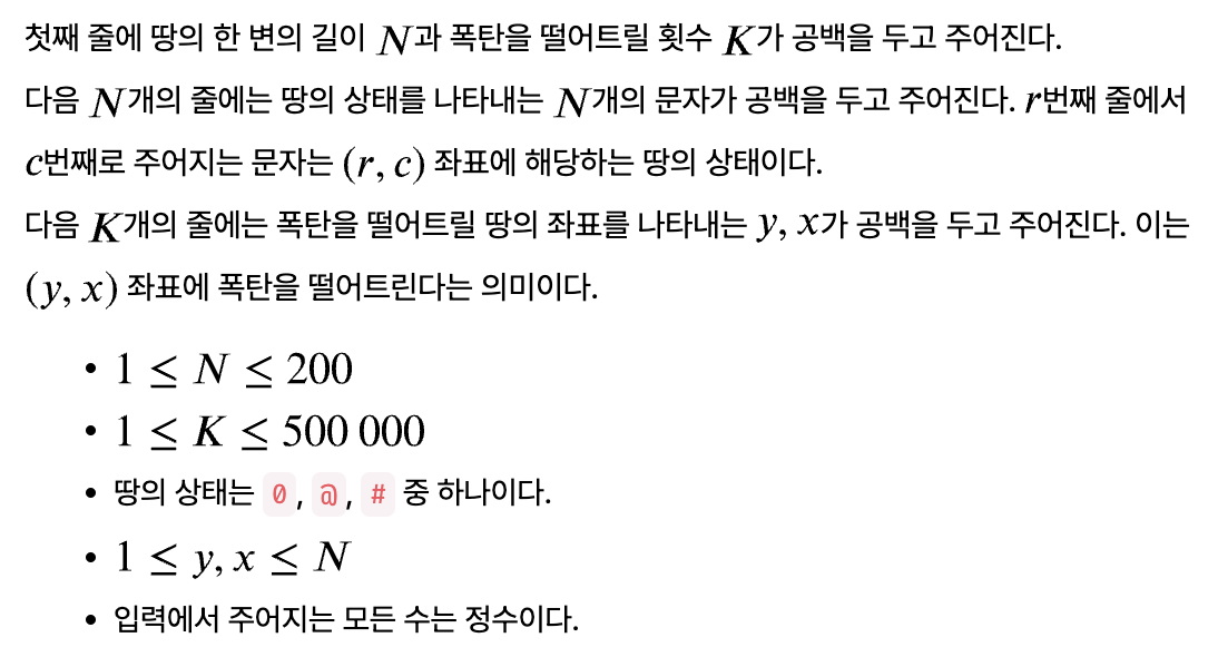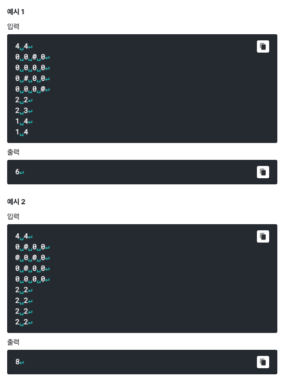 - 위 조건을 만족할 때 만약 map에서 ny, nx가 0이라면 cal의 ny, nx 좌표에 1씩 더해주고, @라면 2씩 더해준다.