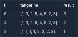 경화가 한 상자에 담으려는 귤의 개수 k와 귤의 크기를 담은 배열 tangerine이 매개변수로 주어집니다. 경화가 귤 k개를 고를 때 크기가 서로 다른 종류의 수의 최솟값을 return 하도록 solution 함수를 작성해주세요.