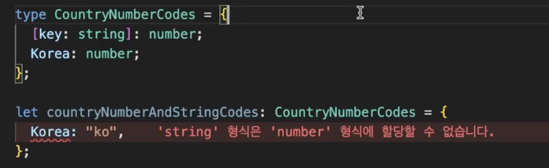 - 단, 이때 Korea: "123" 과 같이 지정해 놓으면 인덱스 시그니처에 정해둔 number 타입에 위반되므로 에러가 발생한다.