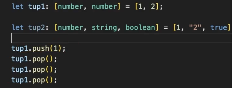 let tup2: [number, string, boolean] = [1, 'hi', true];