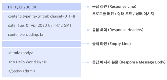 응답 메세지는 응답 라인, 헤더, 빈 줄, 본문으로 구성되어 있다.