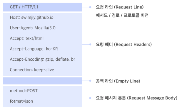 요청 메세지는 요청 라인, 헤더, 빈 줄, 본문으로 구성되어 있다.