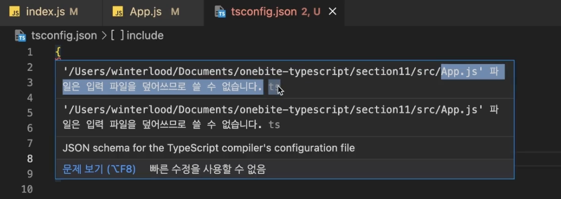 - App.js, index.js에는 jsx 문법을 쓰고 있는데, TS는 기본적으로 js 확장자의 jsx 문법을 해석할 수 없다.