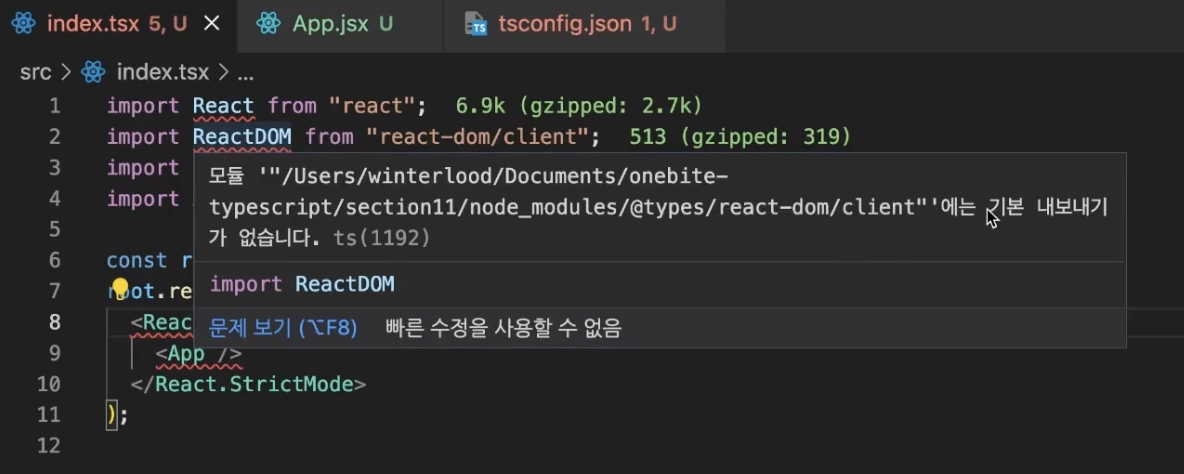 - js -> jsx -> tsx로 바꾸면 import문부터 에러가 발생한다.