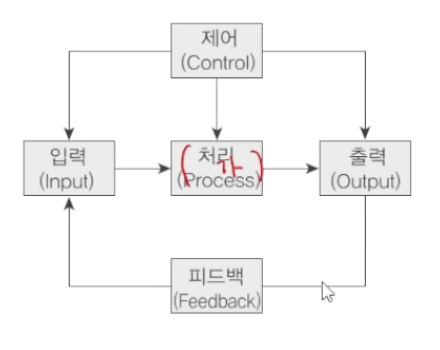 기본 요소: 입력 -> 처리 -> 출력 -> 제어 -> 피드백