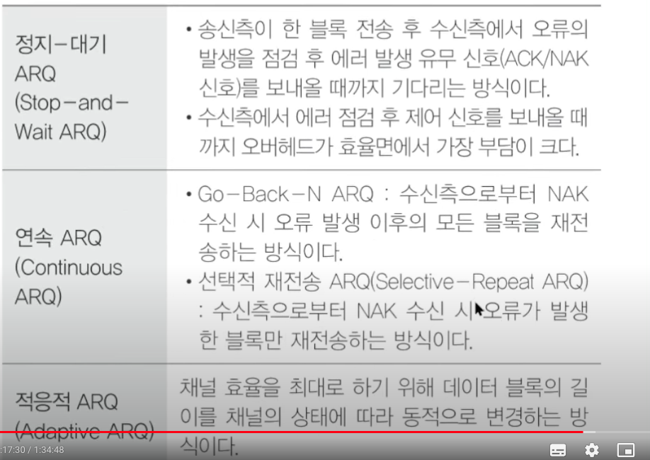 정지-대기ARQ(ACK/NAK), 연속ARQ, 적응적ARQ