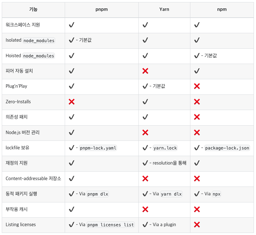 이들 모두 Node.js 환경에서 사용되는 패키지 매니저지만 각 패키지 매니저는 독자적인 설계 철학과 목표를 가지고 개발되었기 때문에 내부 동작 방식과 제공하는 기능에서 차이가 있다.