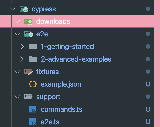 cypress.config.ts, example.json, commands.ts, e2e.ts가 생성된다.