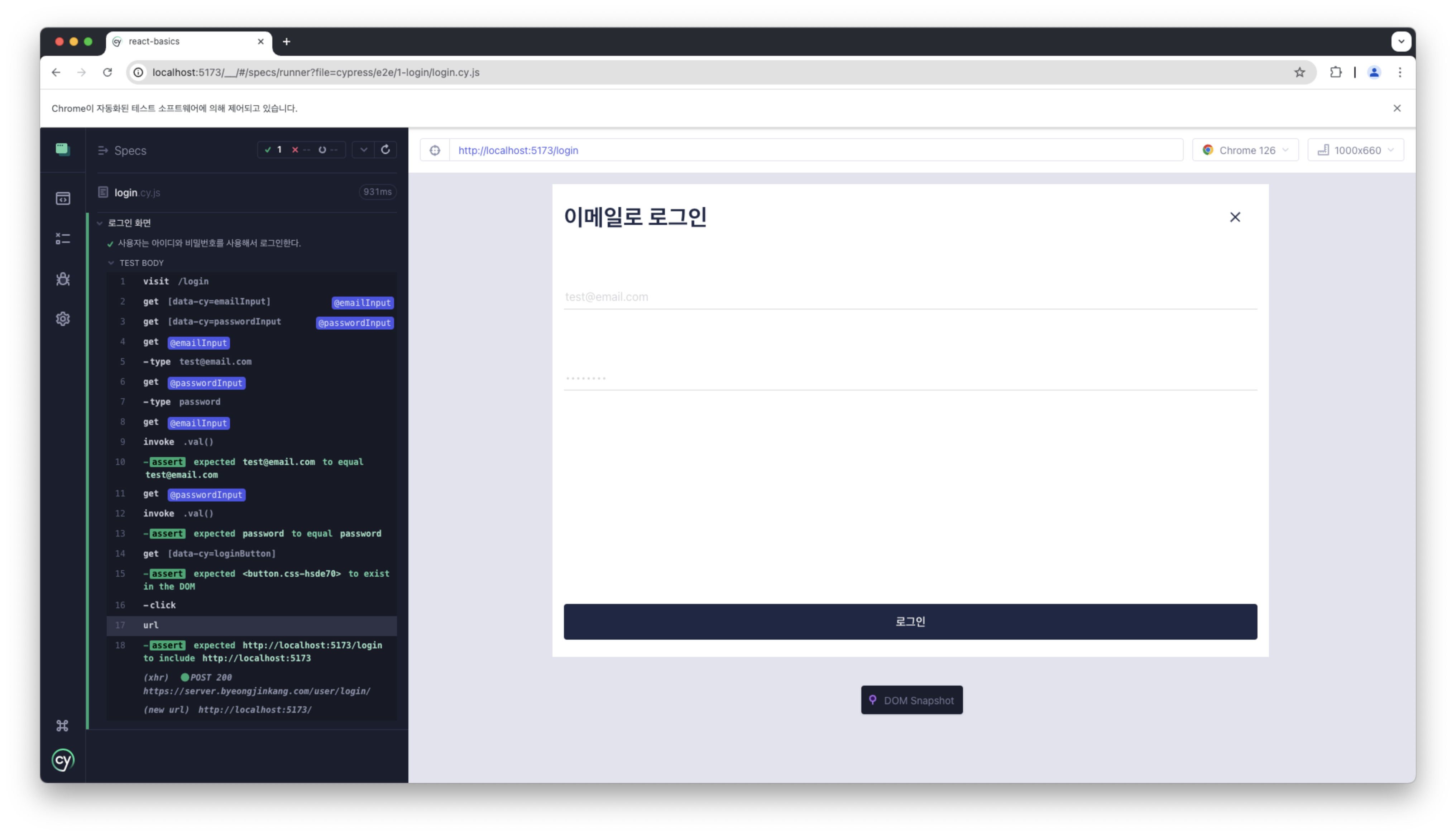 파일을 클릭하면 위와 같이 테스트들이 실제 유저 화면처럼 보여지면서 진행된다.
