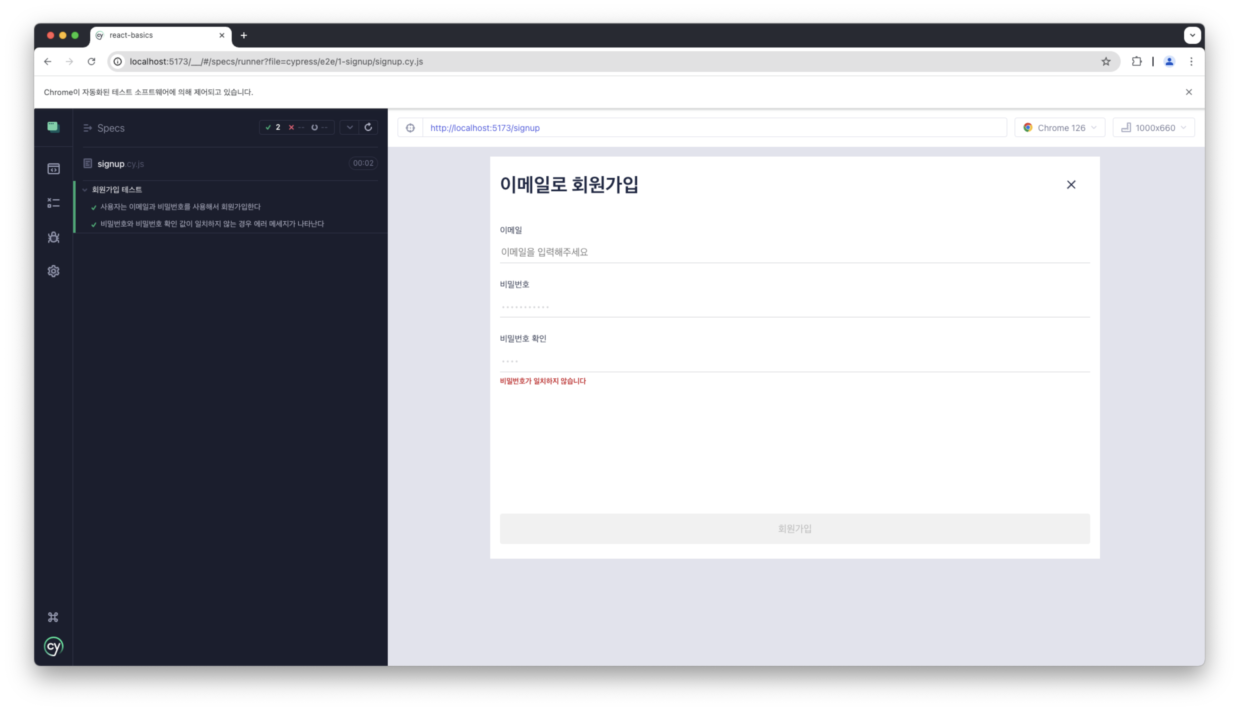 비밀번호/비밀번호 확인값이 같이 않을 때 에러 메세지가 뜨는 것까지 테스트 해보자.